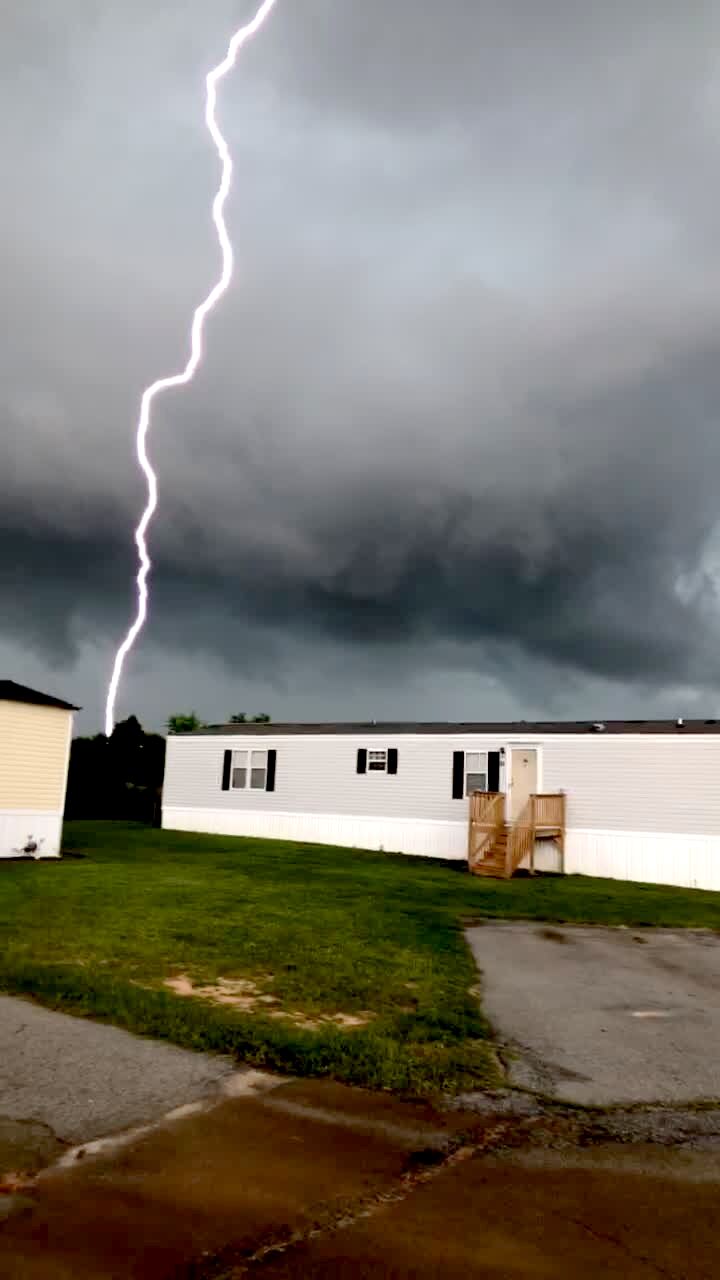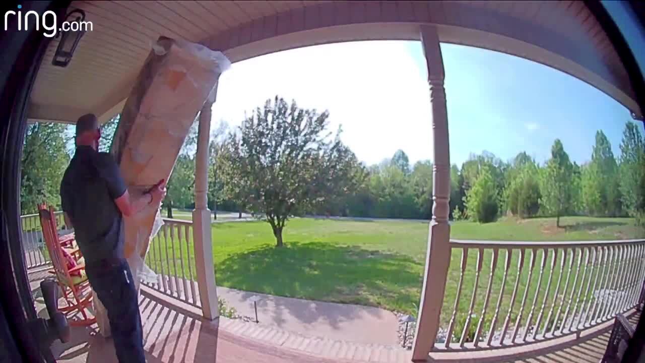Pet goat on leash in yard headbutts little boy holding plastic spool, knocks him down.