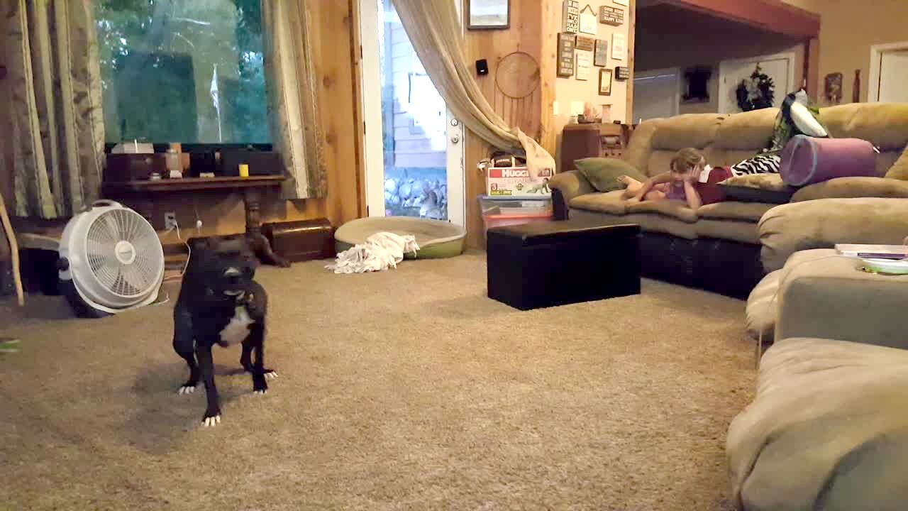 A tot girl pets a dog who then rolls over and falls off an ottoman footrest and rolls onto the girl who then falls down on the living room floor.