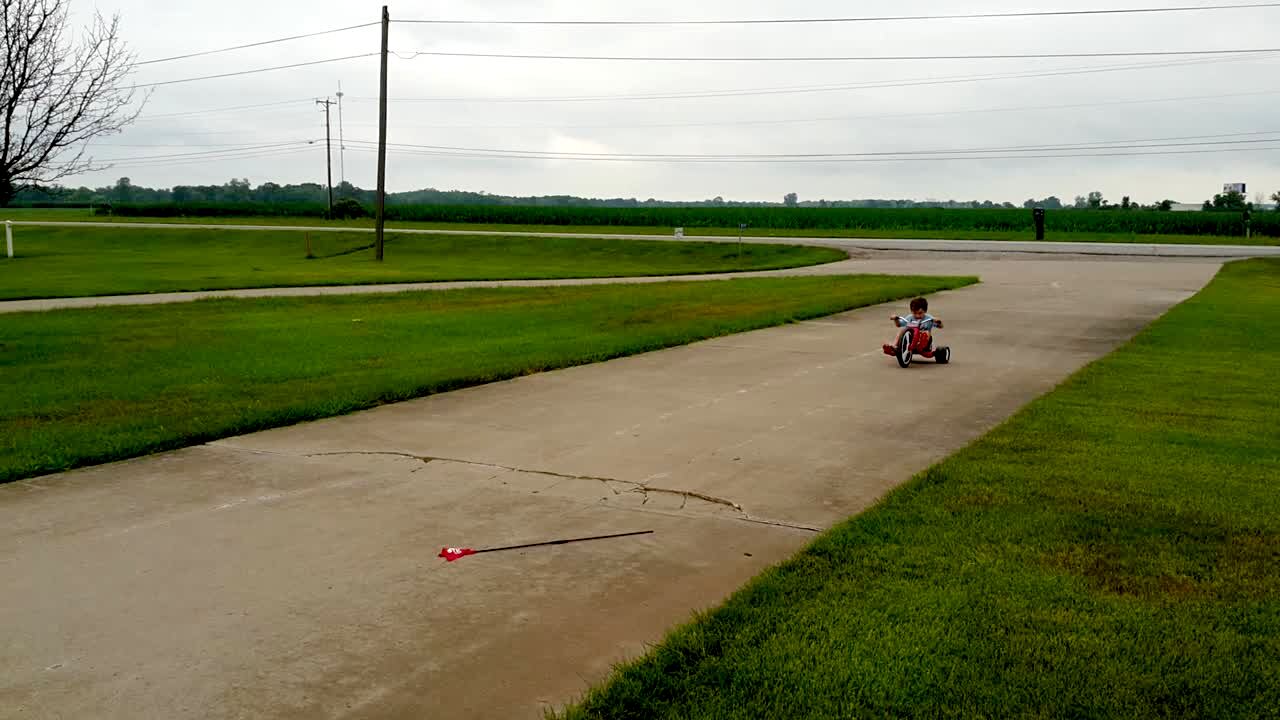A tot boy drives a motorbike in the yard. He crashes into something out of frame and says "I'm okay."
