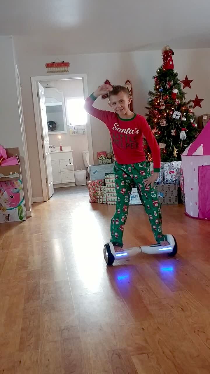 A young boy falls off of a hoverboard in the living room when he rides backwards in to a television stand while he dabs.