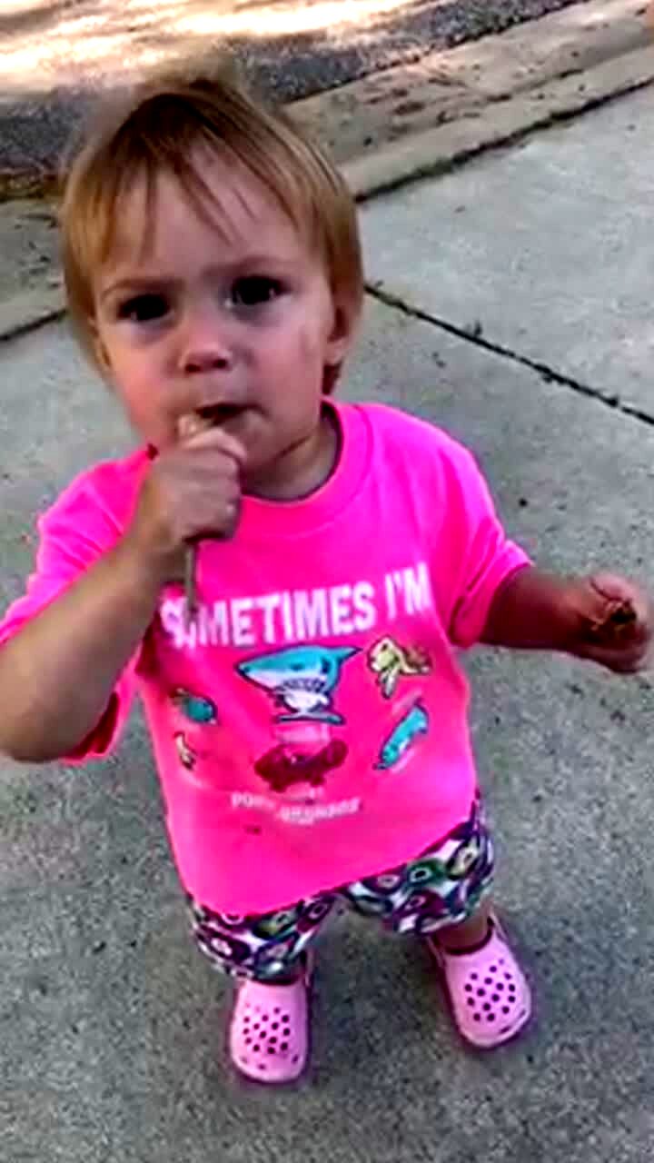 A tot girl puts a dandelion in her mouth when she thinks it's a lollipop.