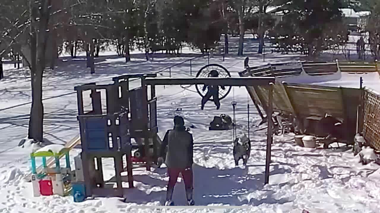 A woman pushes a young boy on a swing in backyard then the boy slips out of swing and face plants into snow. Security footage.
