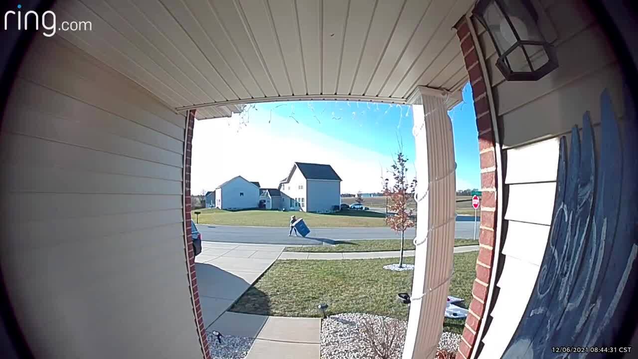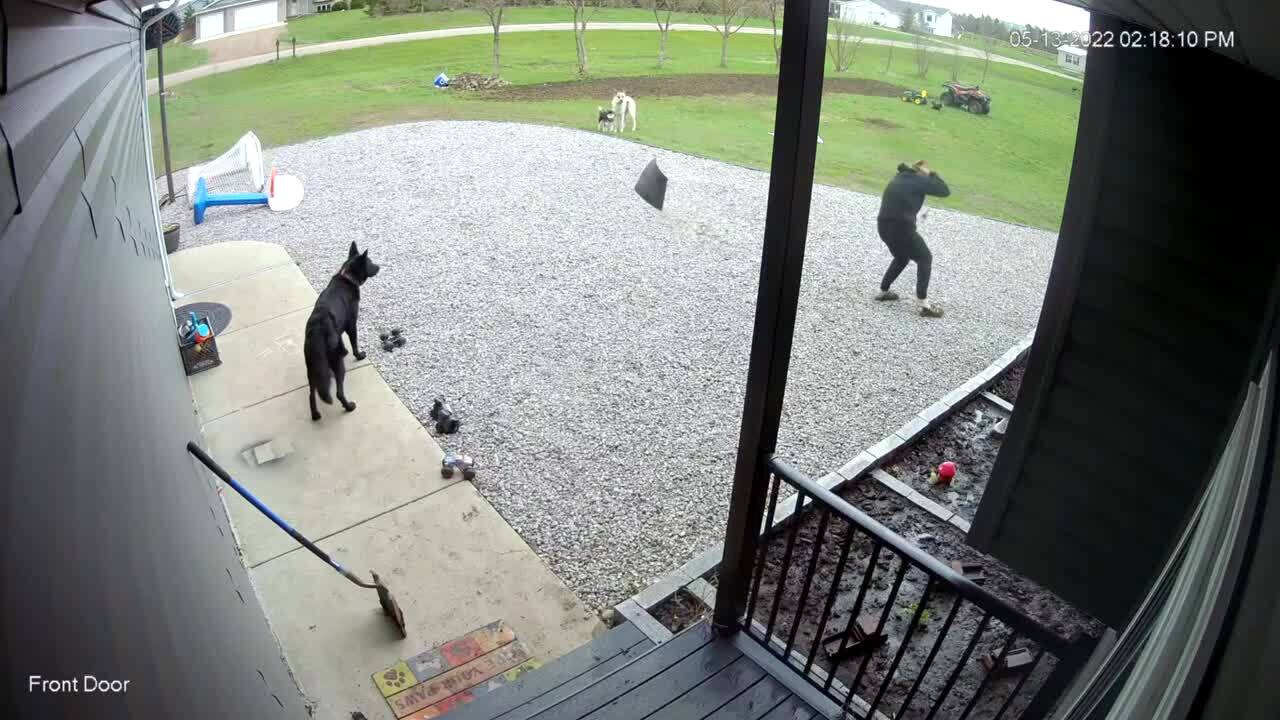 A woman stands outside. The wind blows hard and a rug flies and hits her in the head. Security Camera Footage.