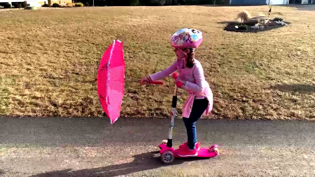 A young girl on a scooter holds an umbrella in front of her. The wind pushes her forward like a sail. Then she falls.