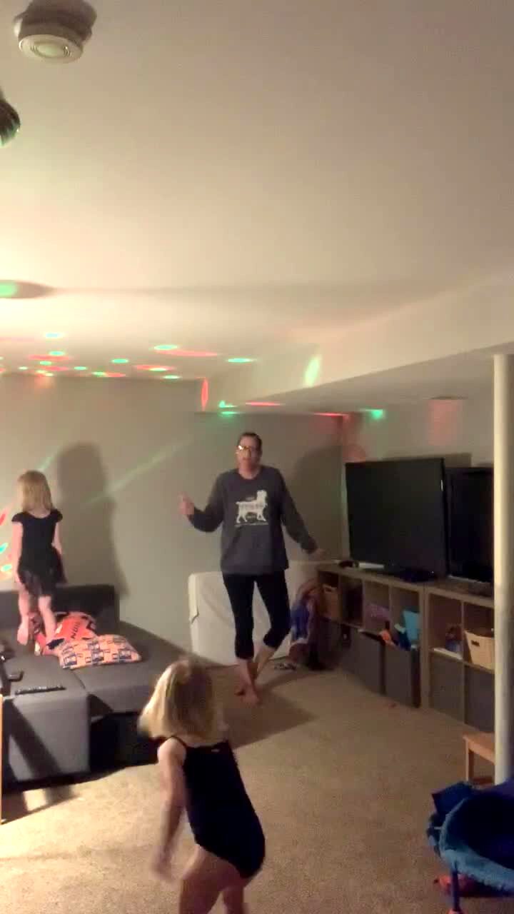 A woman dances in the house, and kicks over her young girl when she does spins.
