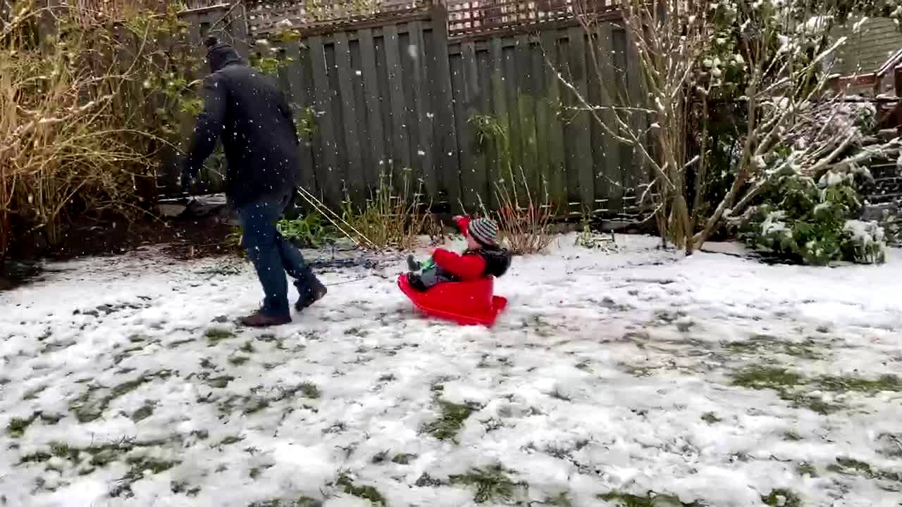 A man pulls a tot boy on a sled through the snow in the backyard, then the man slips and falls.