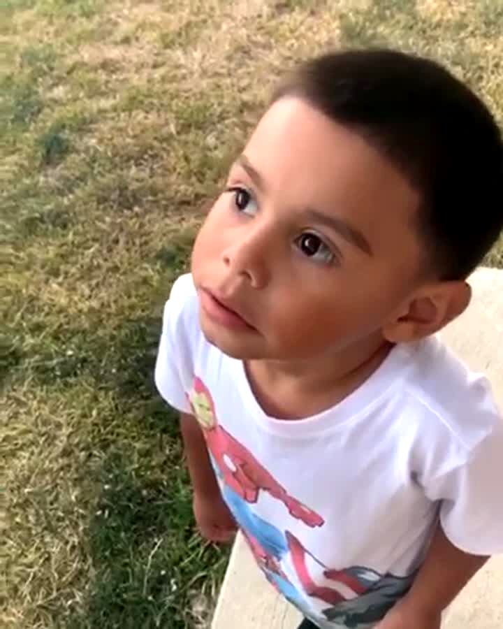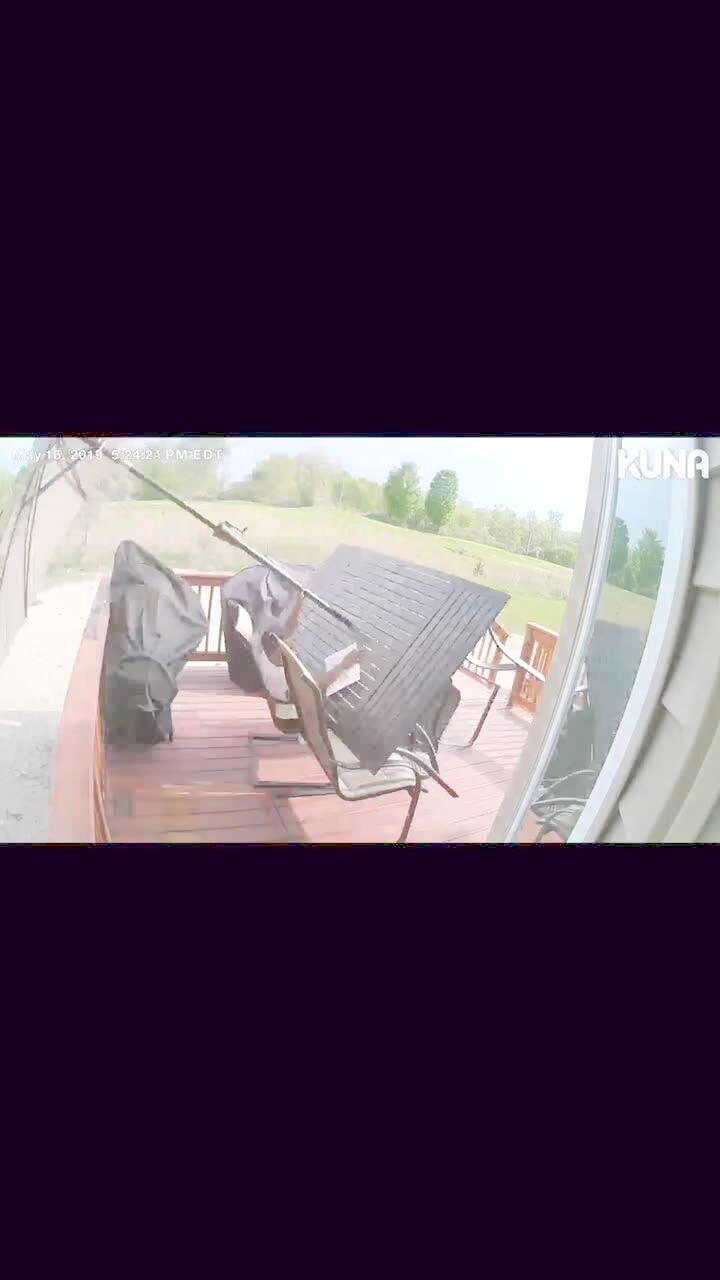 A young boy gets trapped in a patio chair when a gust of wind blows a patio table onto him. Screen recording.