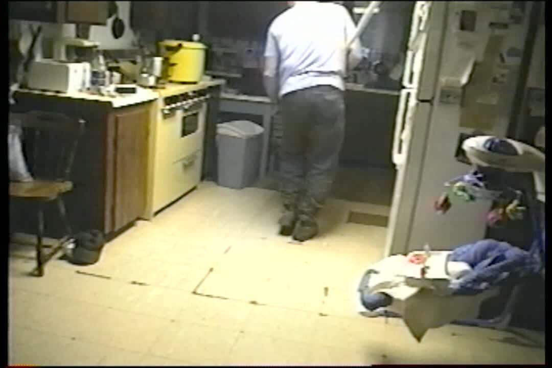 When a cat enters a house carrying a bird a man and young girl scream. The man catches the cat and puts it outside, but the bird flies away inside the house. The man picks up the bird in his hands and then frees it outside. Security footage.