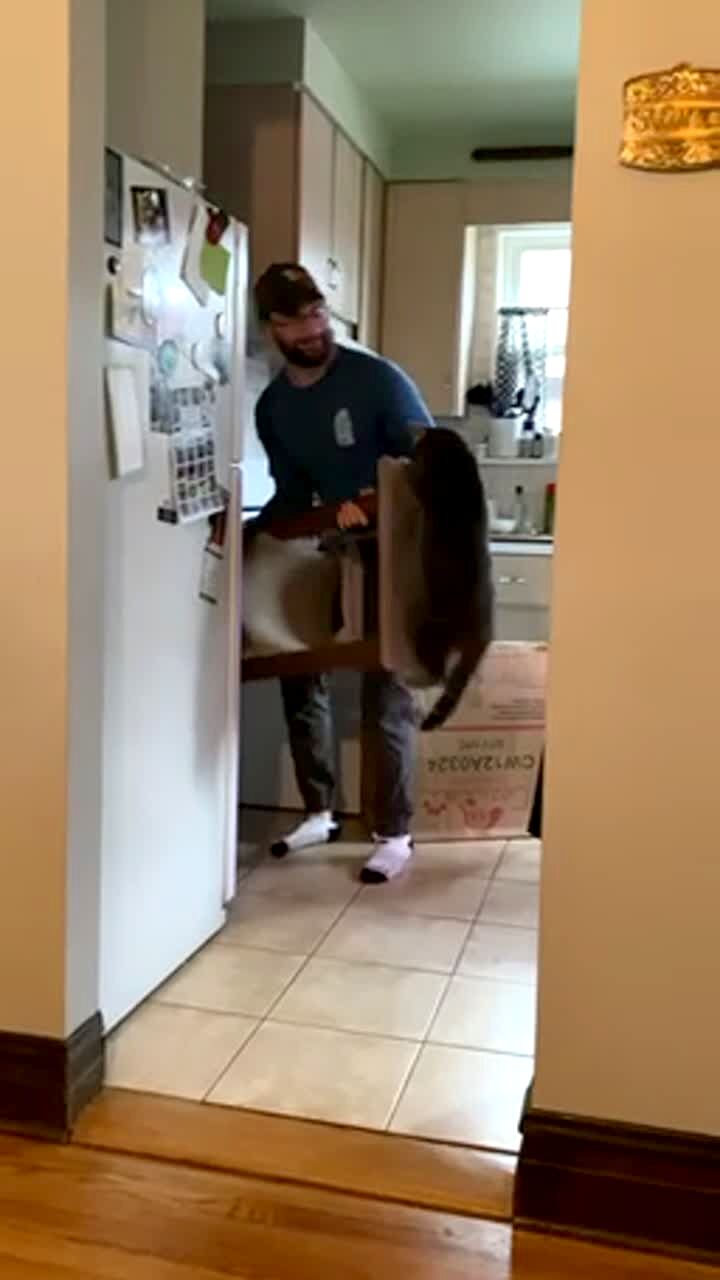 A man tells a cat to get off of its cat tower because he wants to throw it away. He turns the cat tower all the way upside down, but the cat still holds on to it.