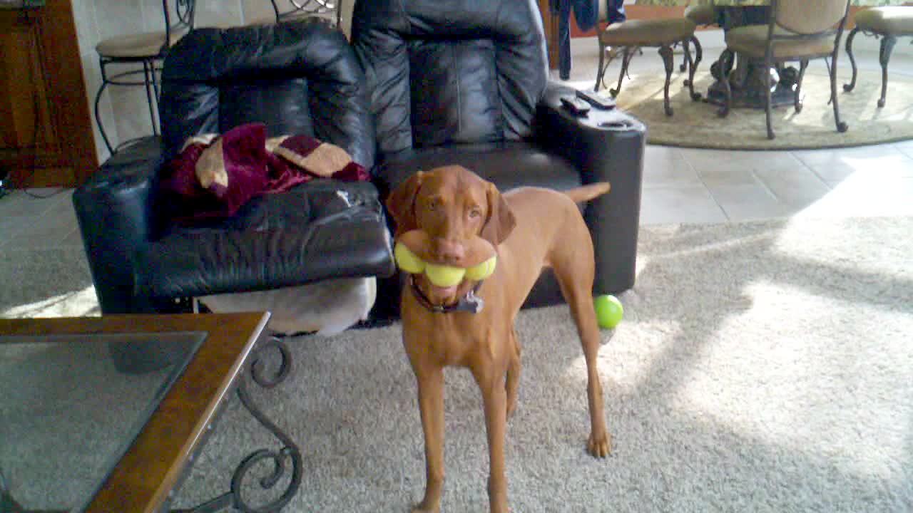 Three dachshund puppies run on treadmill, they chase after Milkbones hanging from strings. Dogs.