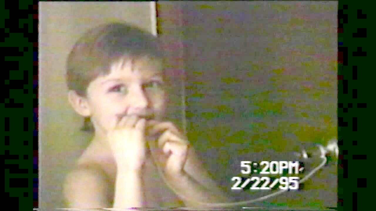 Boxer dog works hard to stay on treadmill. 1994 date on screen