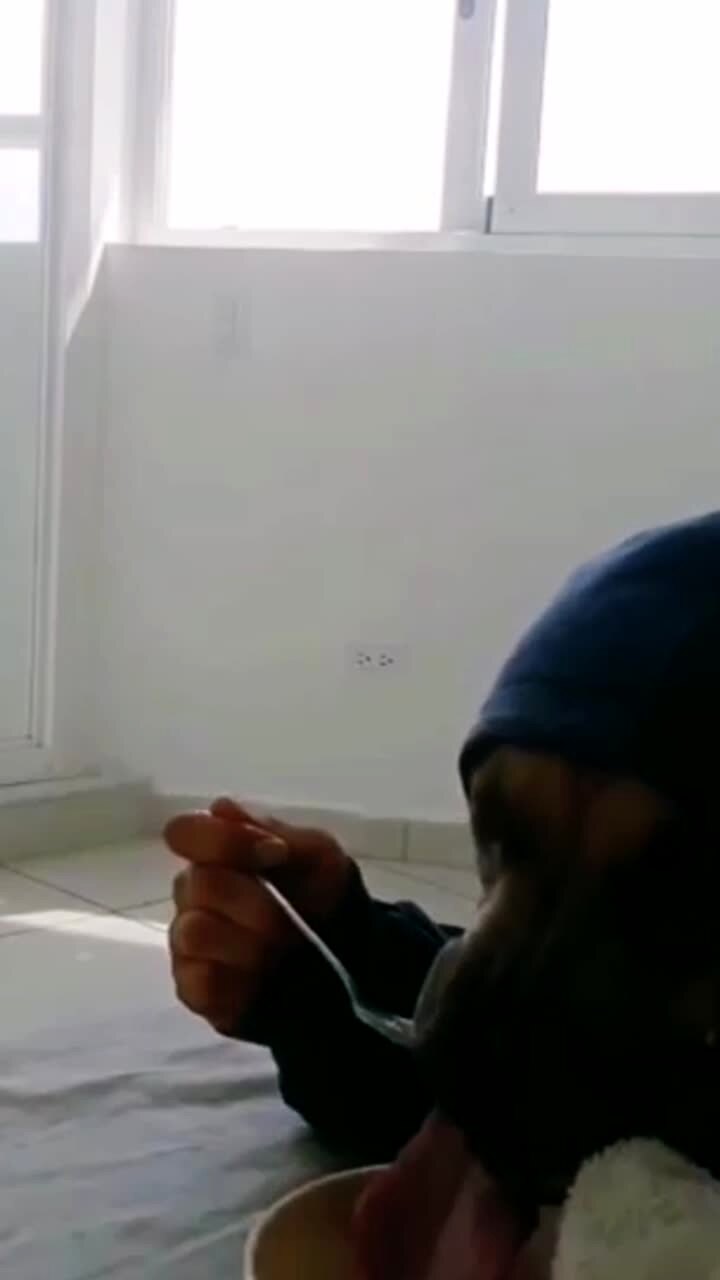 An adult does the Borrowed Hands challenge with a dog who eats a bowl of yogurt. Set to music.