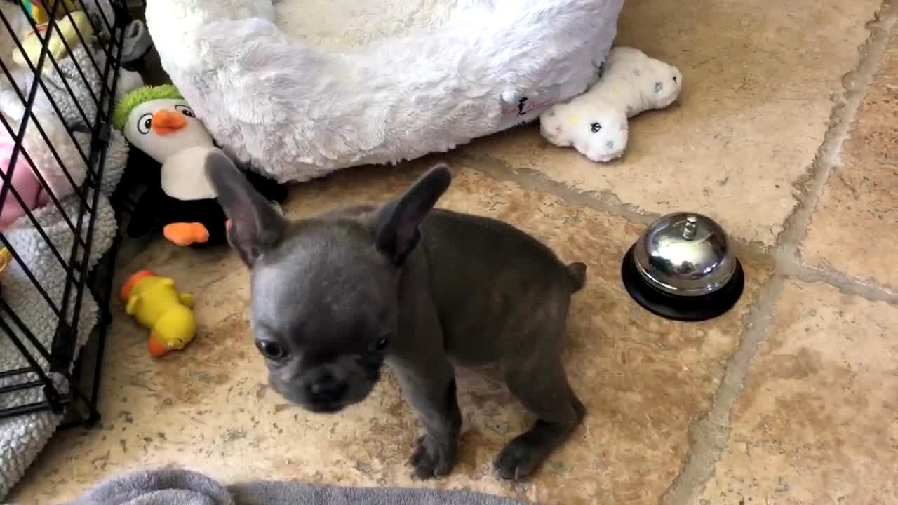 A French Bulldog puppy dog rings a bell in the house and gets a treat.