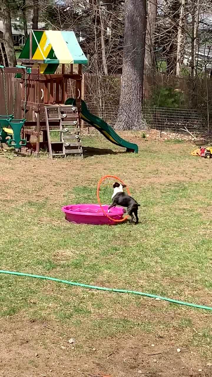 A Boston terrier dog carries a hula hoop as she climbs into a kiddie swimming pool in a backyard.