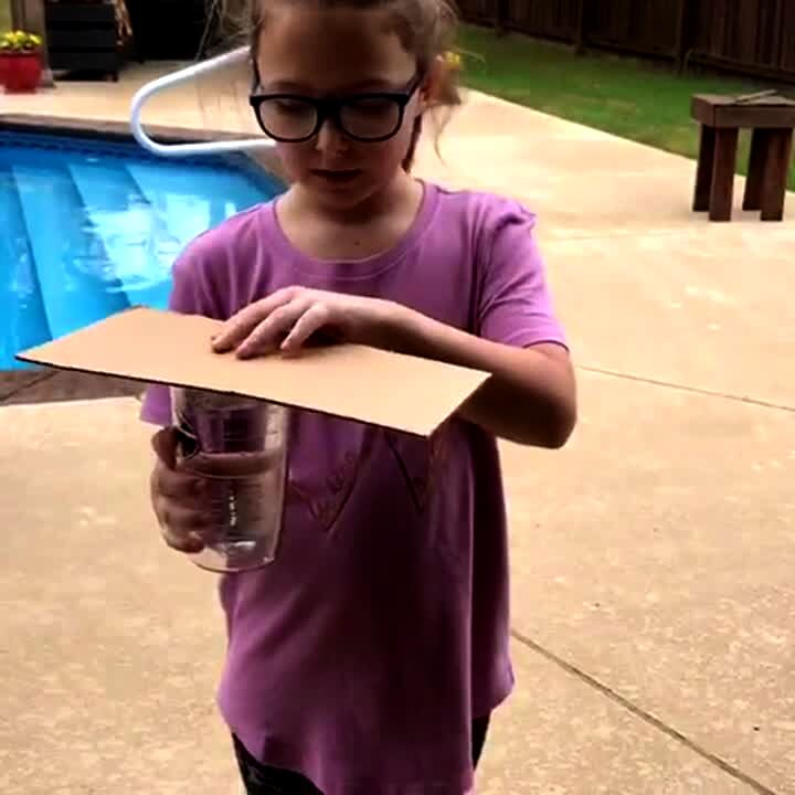 A young girl does an experiment where she uses air pressure to hold a piece of cardboard on an upside down cup so the water inside it won't come out. A dog walks up to the cardboard and pulls it away, then the water spills on the patio.