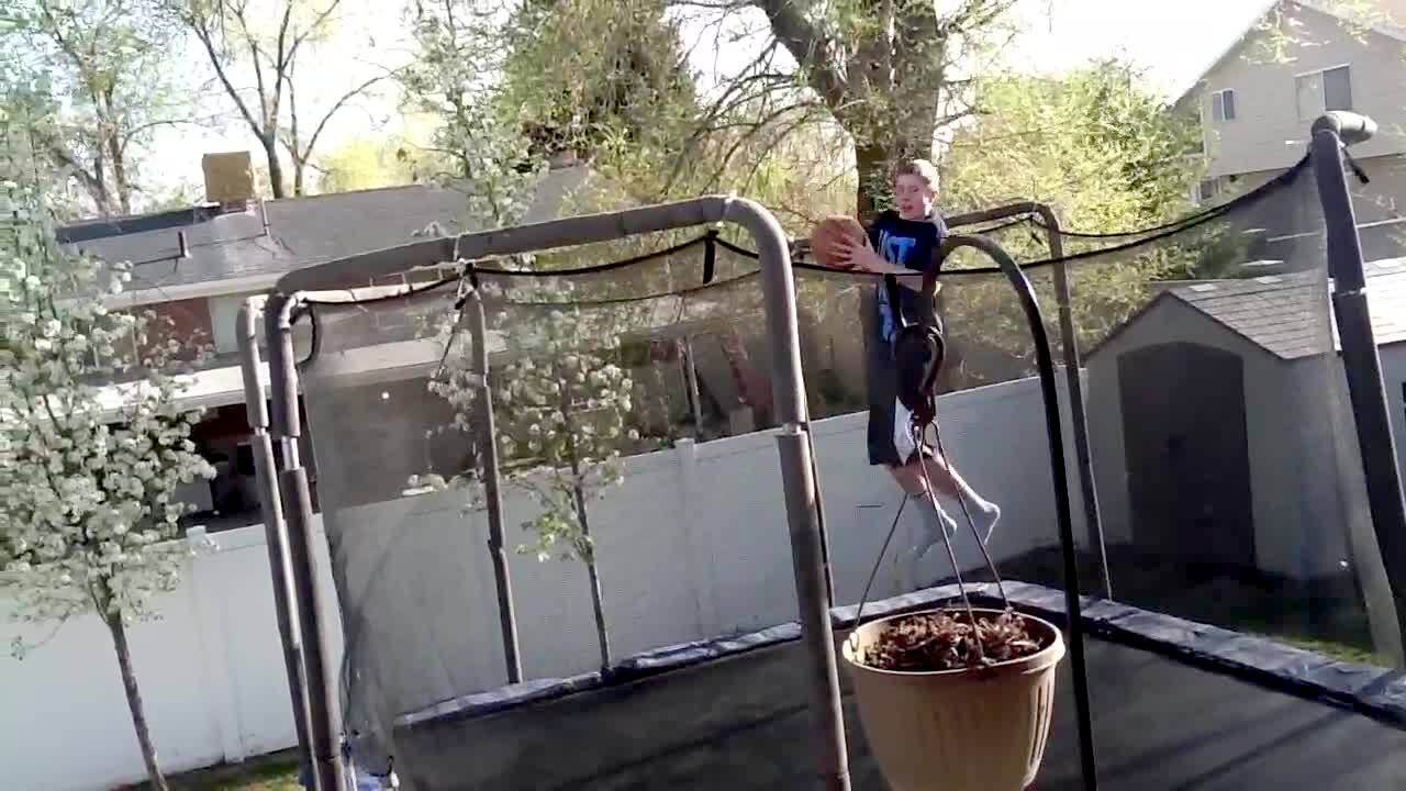 A teen boy shoots a basketball through a hoop while on a swing set outdoors. Basketball Trick Shots