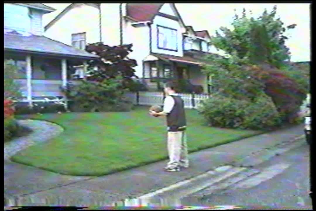 Teen boy shoots basketball backwards & over his head, across the street and into hoop on garage in driveway. Amazing long shot.