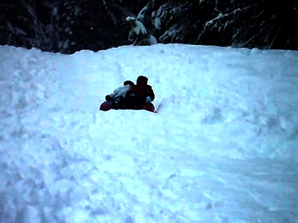 A woman blows a bubbles onto snow on a mailbox and slips and falls and hits her head on the mailbox.