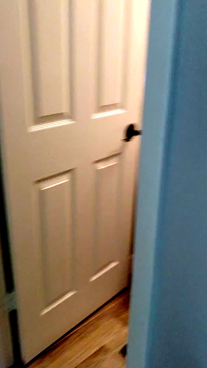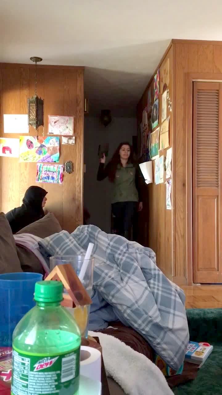 A young man tries to scare a young woman as she walks into a room. But then the young woman kicks the young man in the face.