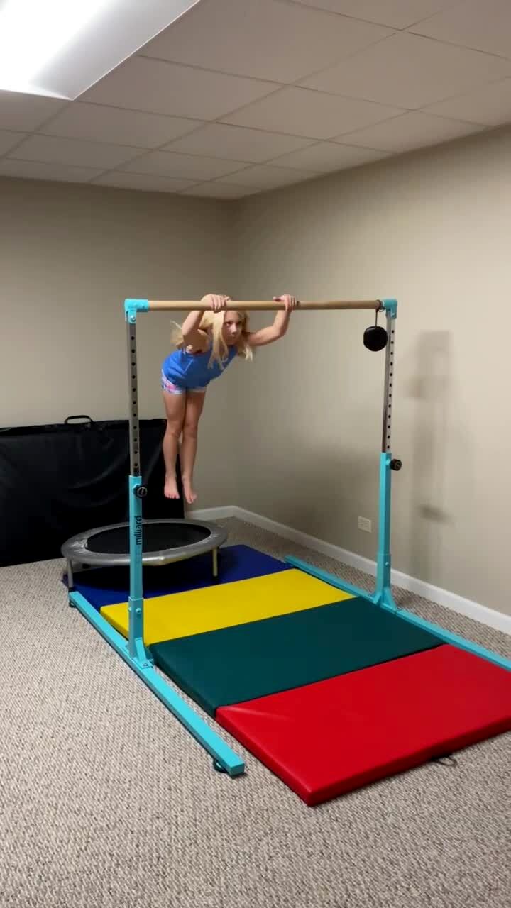 A young girl jumps onto a gymnastics bar in the house, and kicks in the ceiling tiles. The light in the room goes out and she says "sorry."