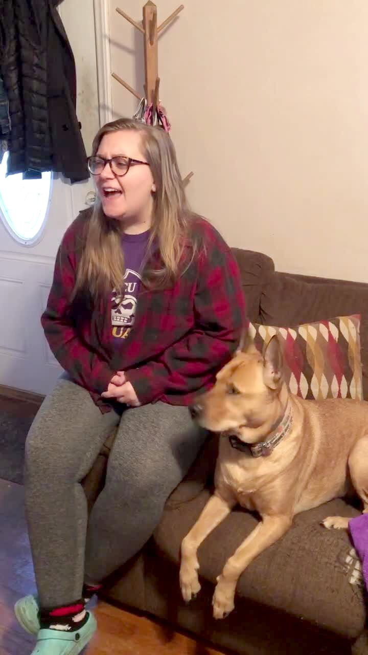 A young woman does the call your dog challenge in the living room, and her dog looks around while she calls his name. The dog then jumps on the woman with the camera and knocks her down. First person POV.