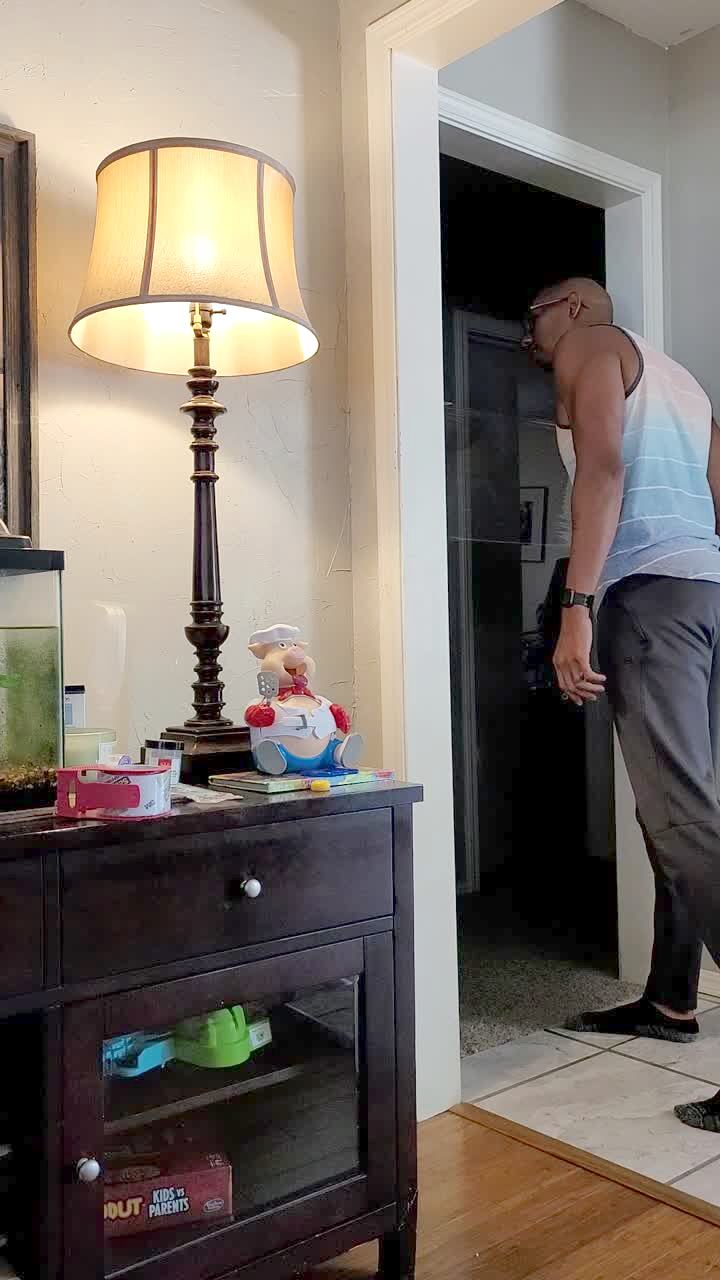 A man calls his young son into the living room, and the boy runs into a sheet of plastic wrap across the doorway.