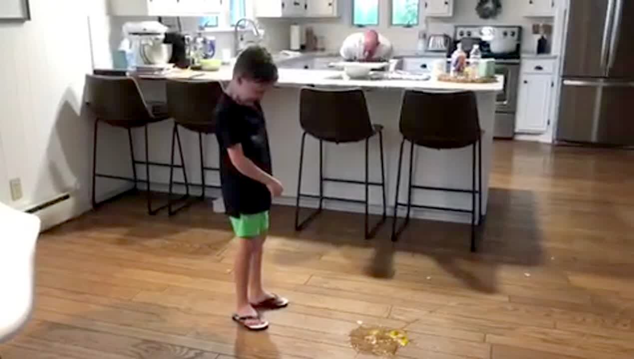 A man pretends to bounce an egg on the kitchen floor behind a counter and catch it to trick his young son, and then he gives it to his son to bounce it. The boy does and the egg cracks and splatters on the floor.