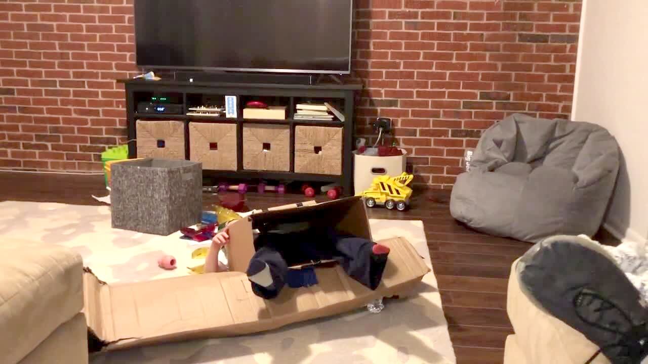 A young boy and a tot boy pretend to be robots in cardboard boxes, but they both fall over. The tot boy falls on top of the young boy, who screams for him to get off.