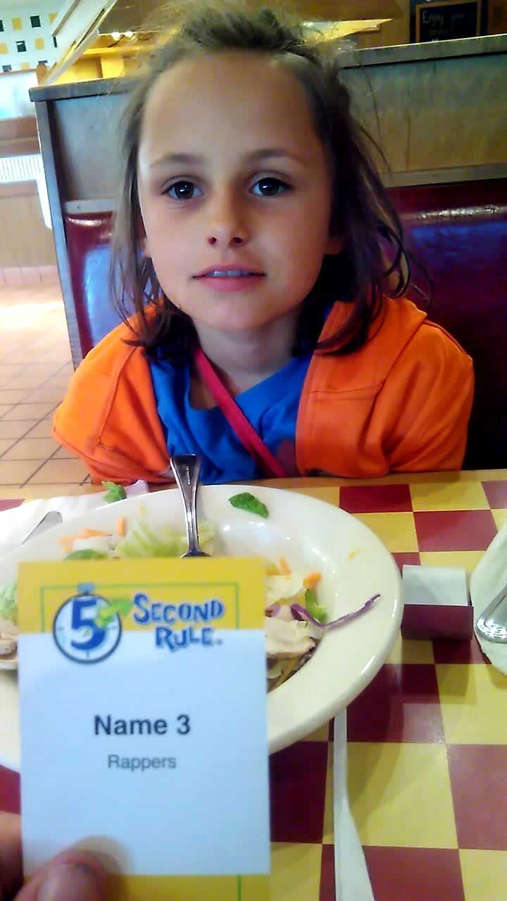 A woman asks a young girl to name three rappers at a restaurant and she names three wrappers.