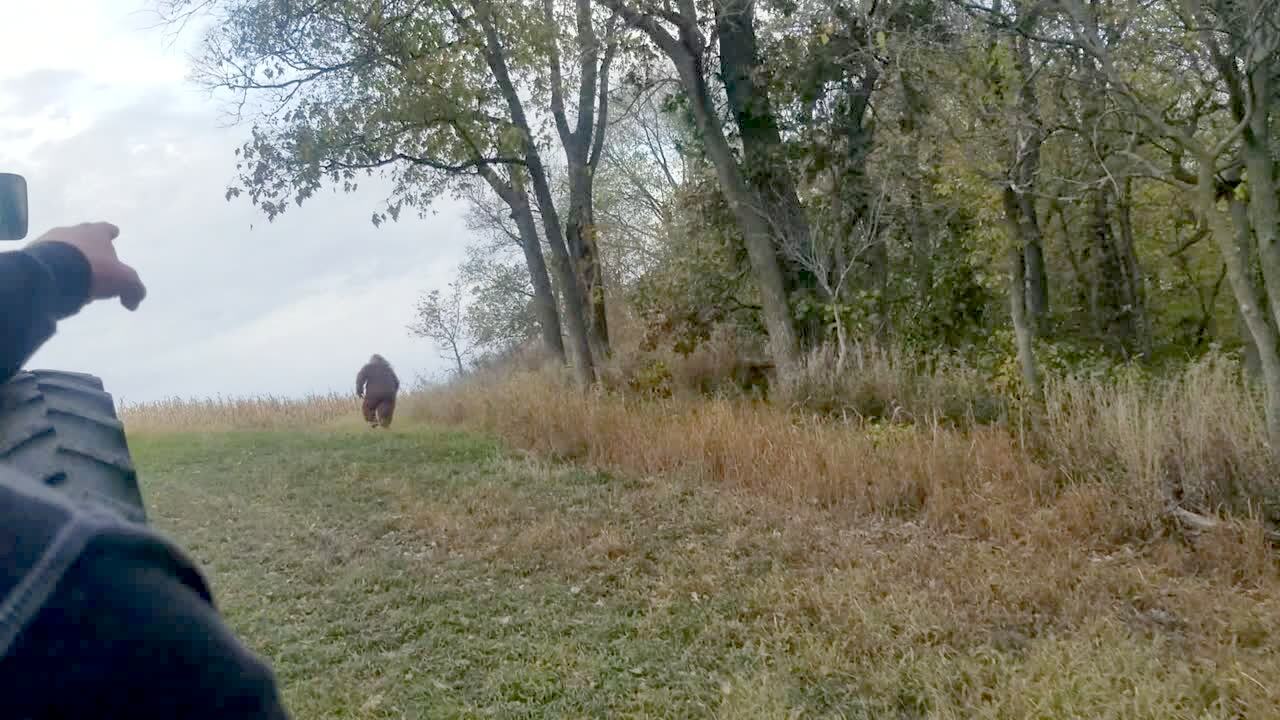 As a practical joke, a man jumps out of a vehicle in a corn field, and chases another man dressed as Sasquatch who emerges from the forest. The Sasquatch pushes the man onto the ground as children scream and yell and he disappears into the field.
