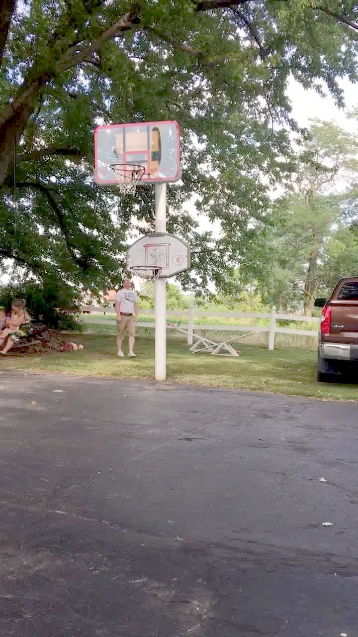 A senior man and a young girl play basketball together in a driveway. At :39, the grandpa throws the ball and falls back hard onto the concrete. The woman behind the camera screams and runs up to him.