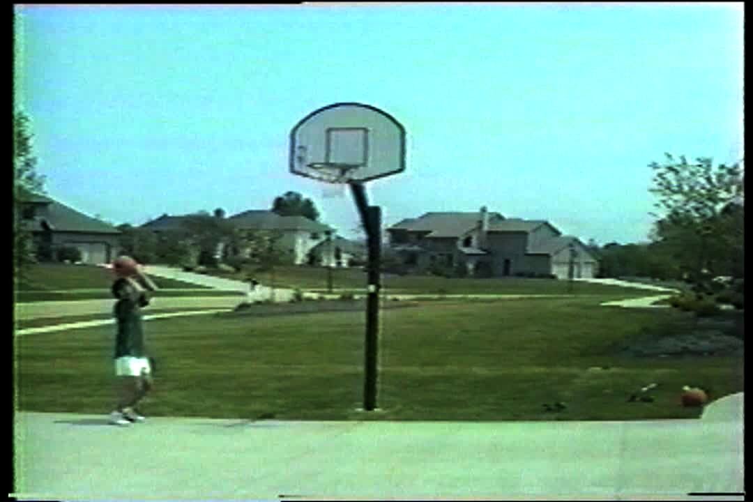 A man shoots a basketball into a hoop and it knocks a young boy's plate of cake out of his hand, then the man catches it immediately in a driveway. Security camera footage.