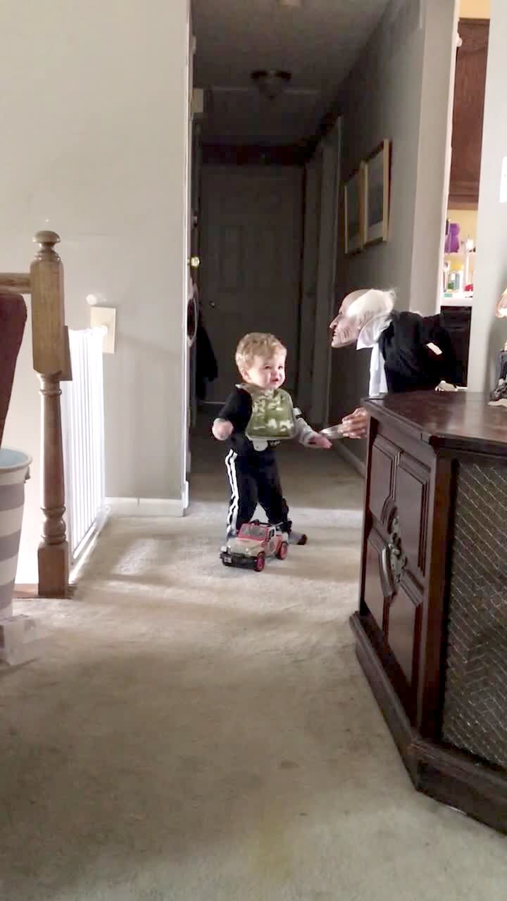 A tot boy screams and runs down the hallway after an electronic butler statue starts to talk to him as he walks by.