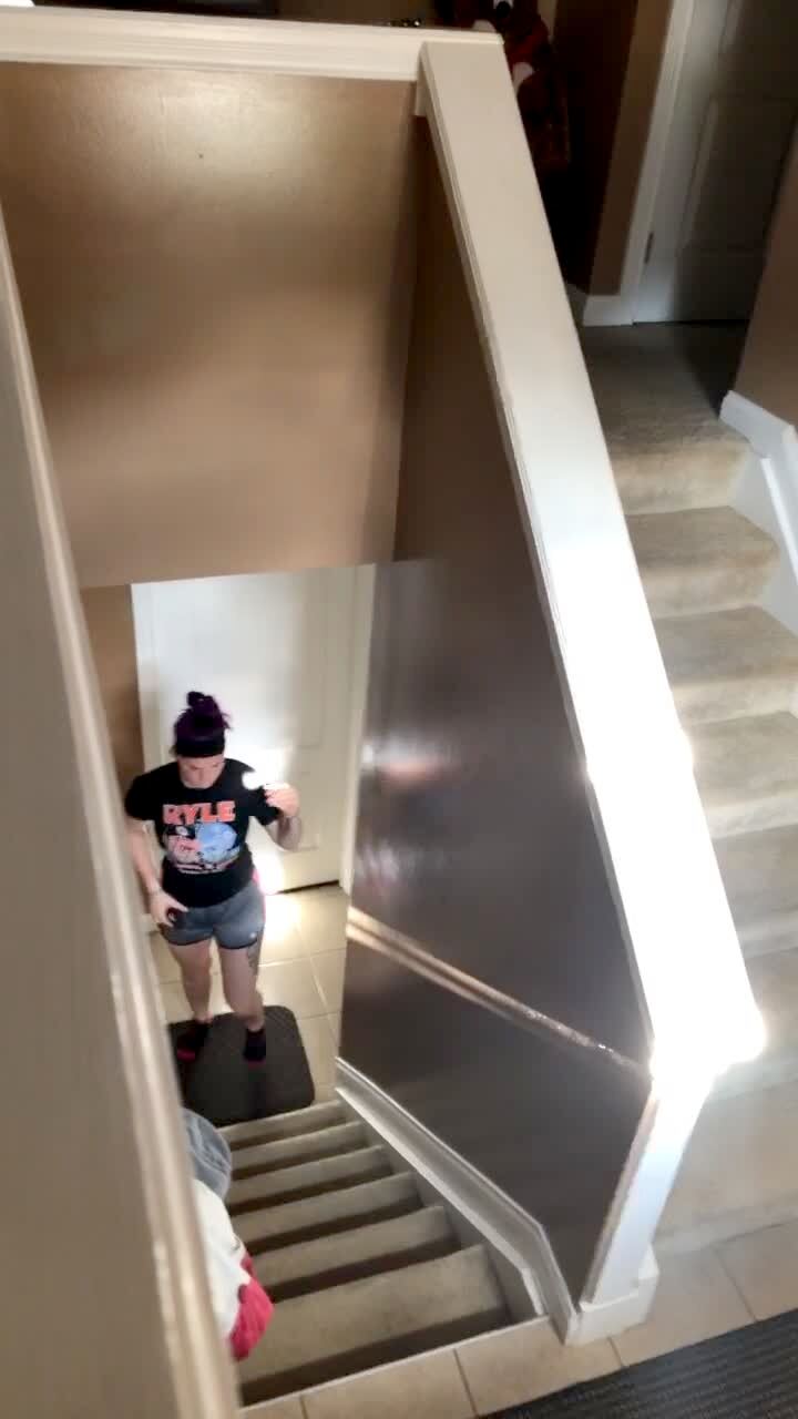 A man laughs when he drops a large water balloon on his teen daughter's head as she walks upstairs.