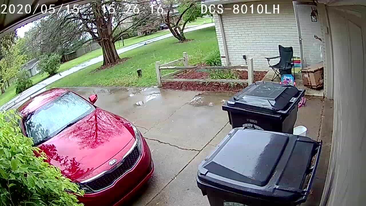 A man tries to force a truck's trunk door closed and the window shatters in a driveway. Security camera footage.