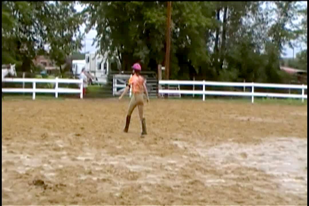 A man climbs out of an above-ground pool, but the ladder breaks and he falls on the grass. Security footage.