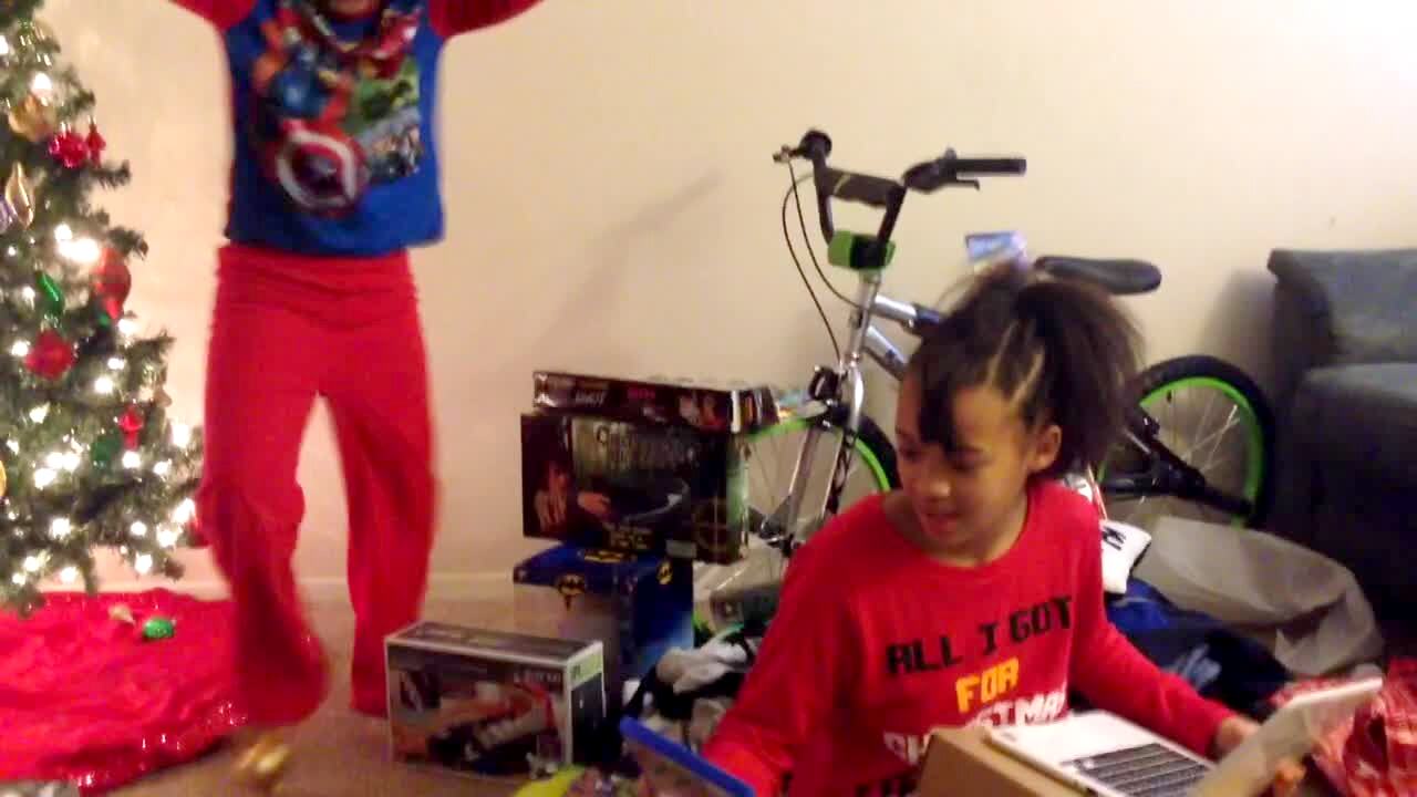 A young boy screams loudly when he gets a video game for Christmas. He gets up and dances beside his sister while she sits on the floor.