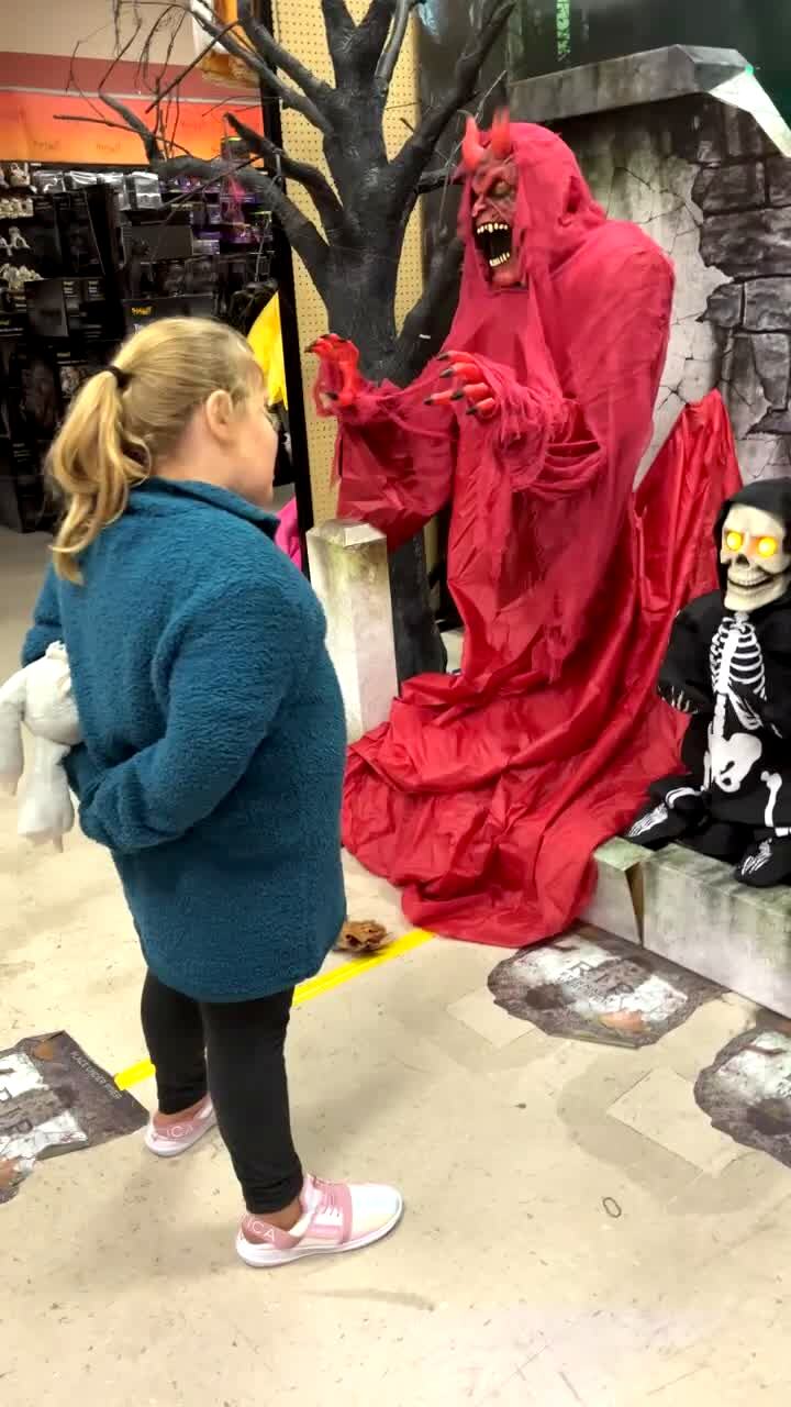 A young girl in Halloween store activates a little skeleton decoration. It jumps so she gets scared and falls on her butt