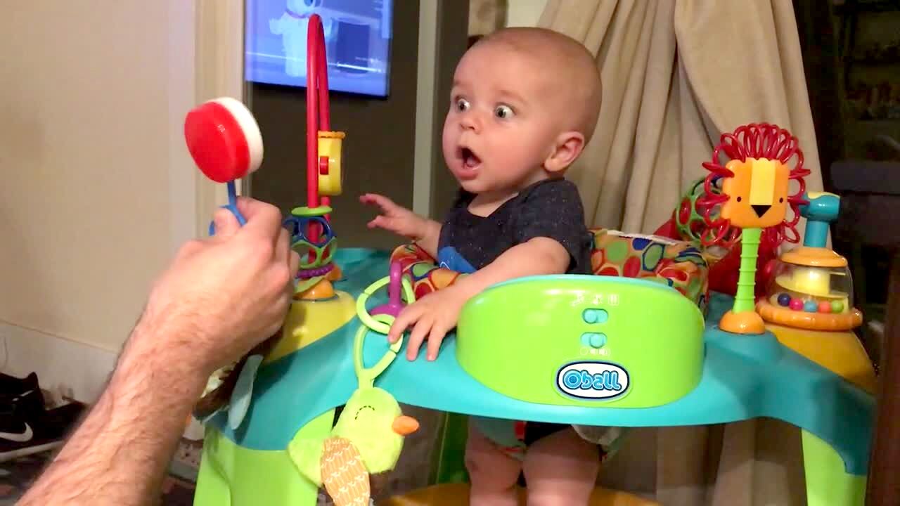 A baby boy reacts to a toy rattle and his eyes get really big with surprise.