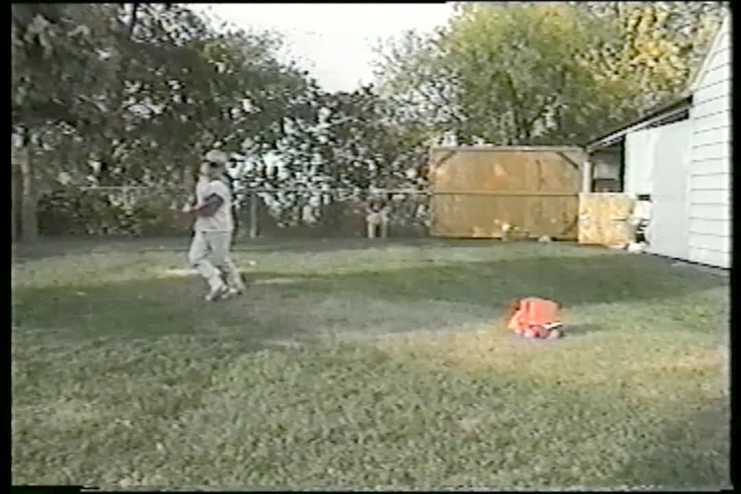 Two young girls play in a back yard. One girl stands on a swing set swing. She falls off the swing onto the ground. The swing swings into her face and hits her. Short heads. Short tails. Clip fades out.