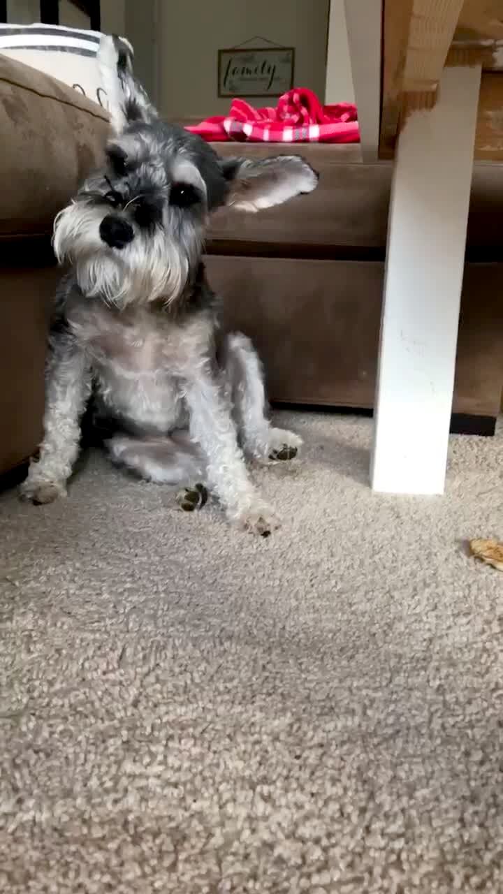 A woman asks her schnauzer dog if he has a pancake in his mouth, then he spits a half eaten pancake onto the living room floor.