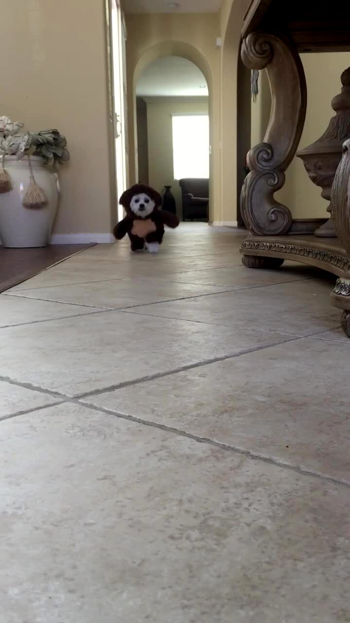 A small white dog in a bear costume runs up to a woman, and it looks like the bear body waddles.