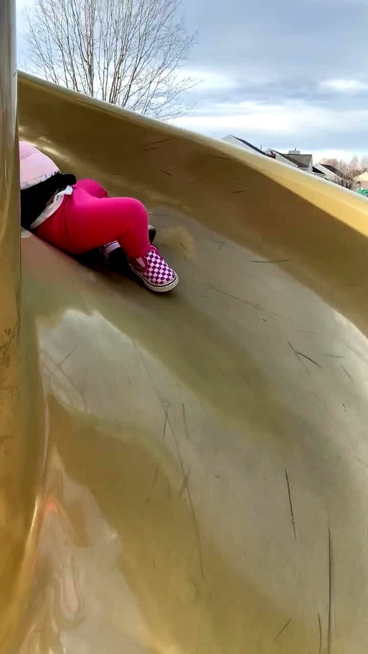 A tot boy and girl go down a slide at a playground park. The girl lies on her back as she slowly moves down the slide.