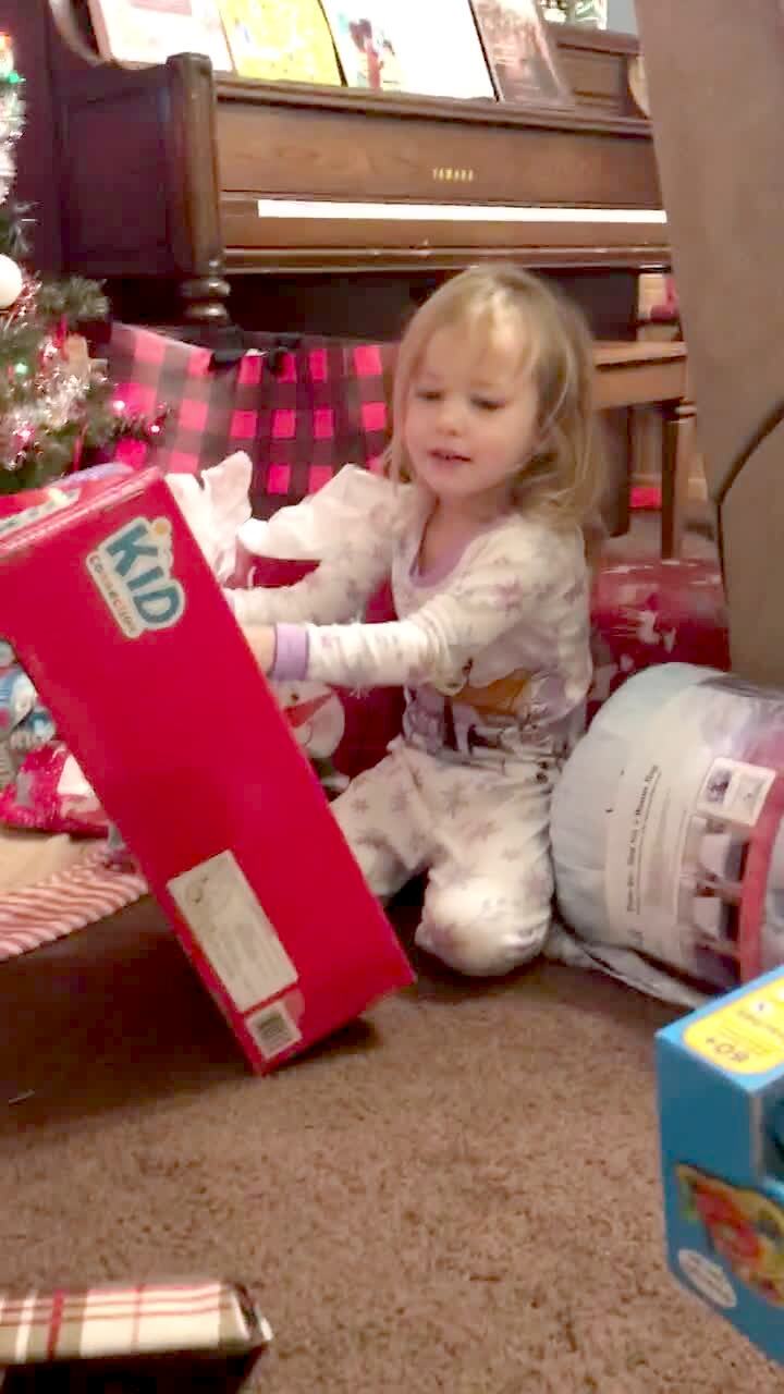 A tot girl says that a toy is "exactly what she wanted" in the living room. She then asks her mother what it is.