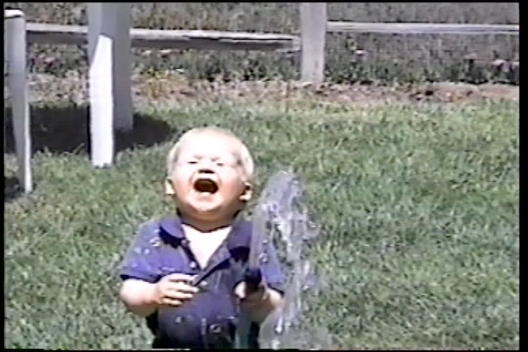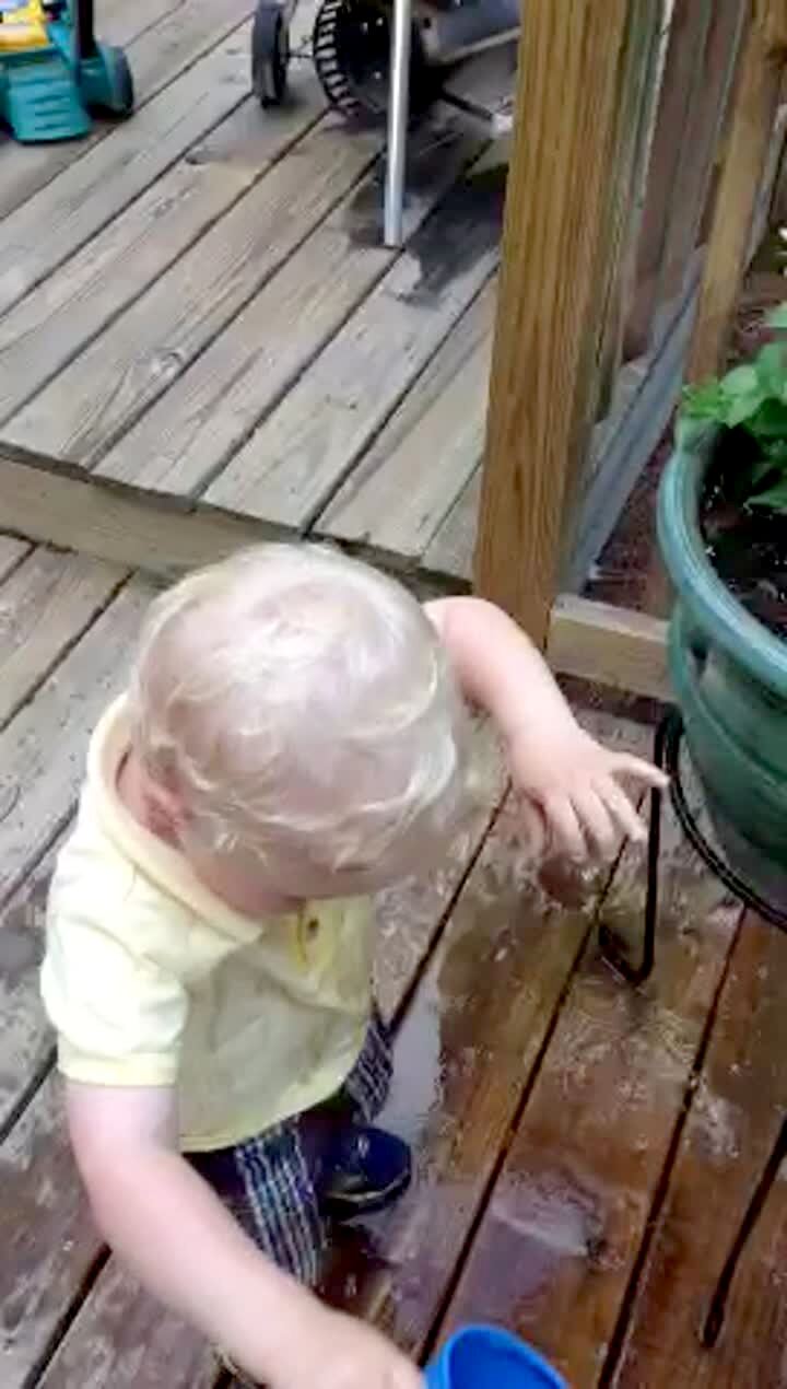 A tot boy pretends to mow the lawn and then a sprinkler sprays him and he falls into a bucket.