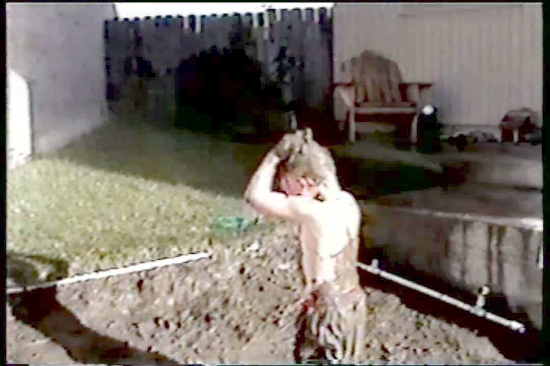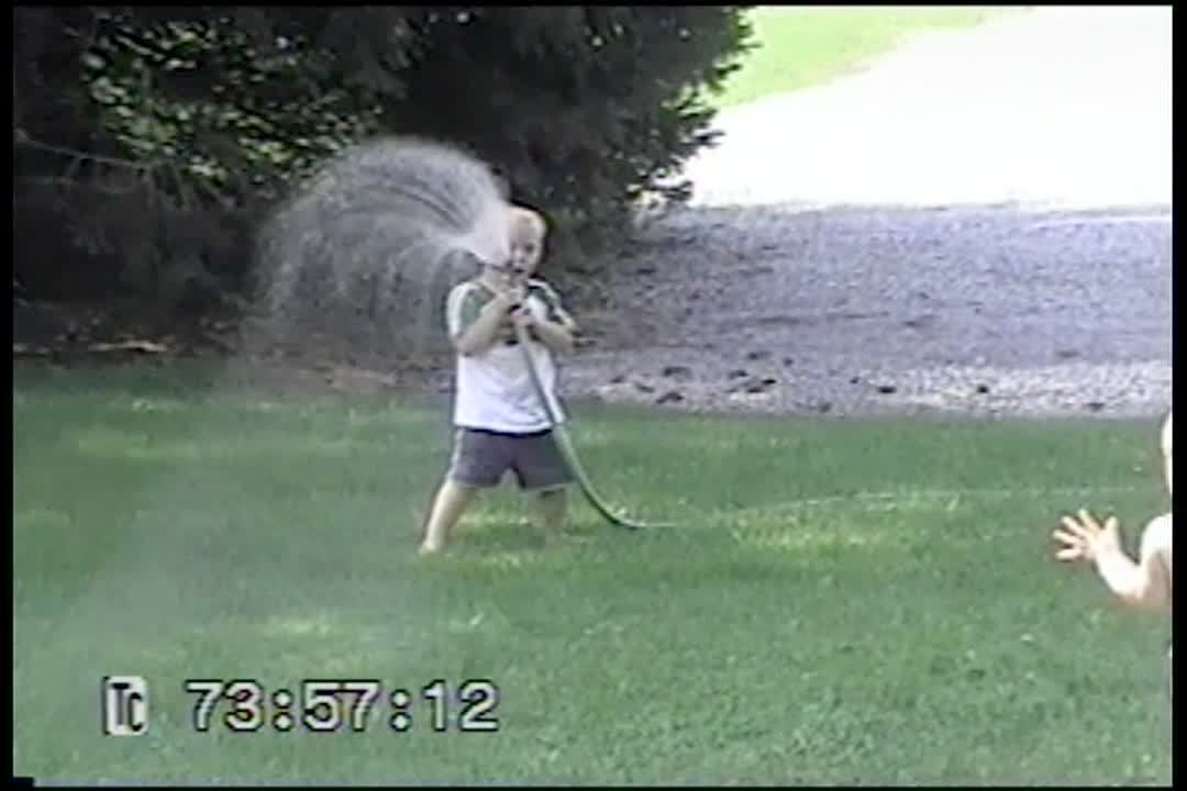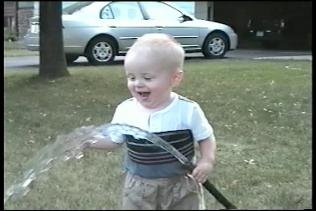 "Drinking Problem" Tot boy tries to drink from garden hose. He keeps spraying himself with the hose. He says "ahh" when he finally gets a sip. He is soaking wet. Cute