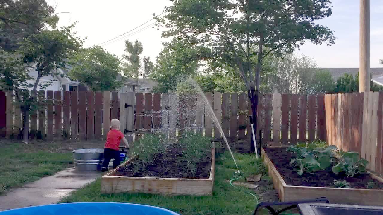 A tot boy pours water on his face/ shirt while trying to water a flower at :15.