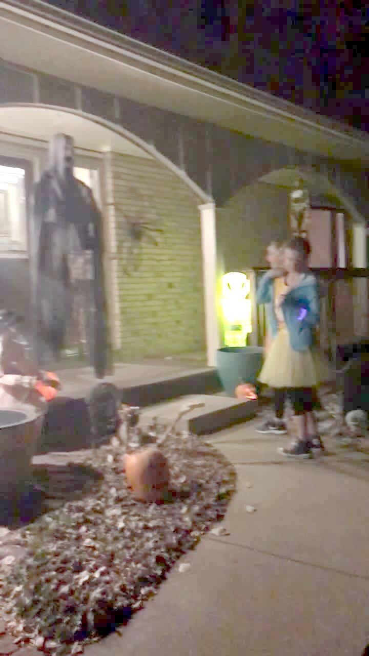 A young girl falls down when a halloween decoration moves and scares her.