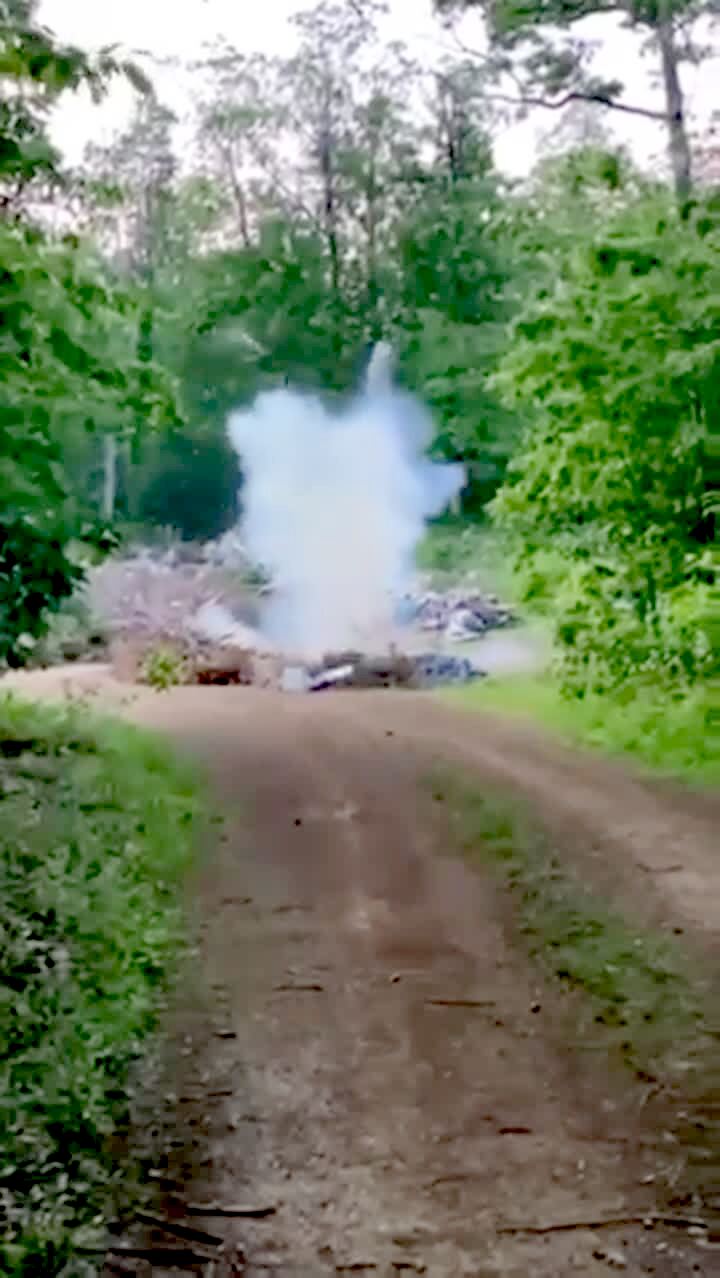 A man drives a tractor and uses it to clear a field and the tractor crashes and falls into a sink hole.