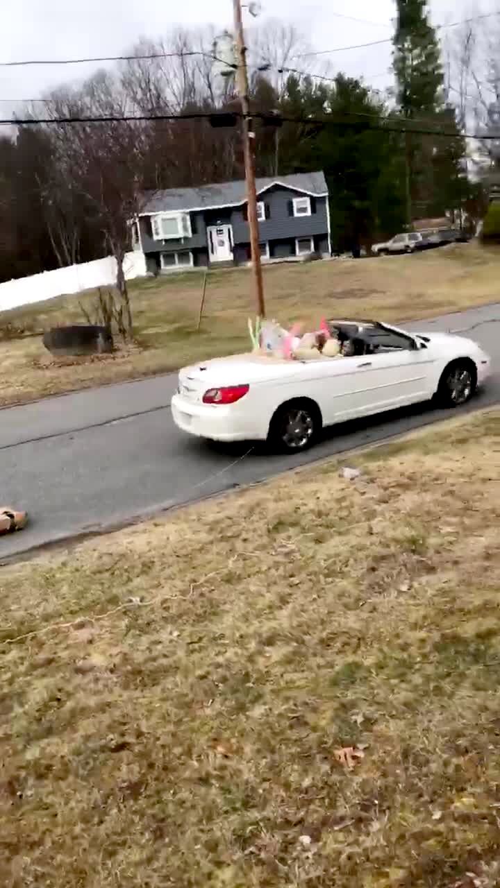 A car runs over a young boy's birthday present in a street as a parade of cars drive past his house to celebrate in quarantine and his mom yells and laughs.
